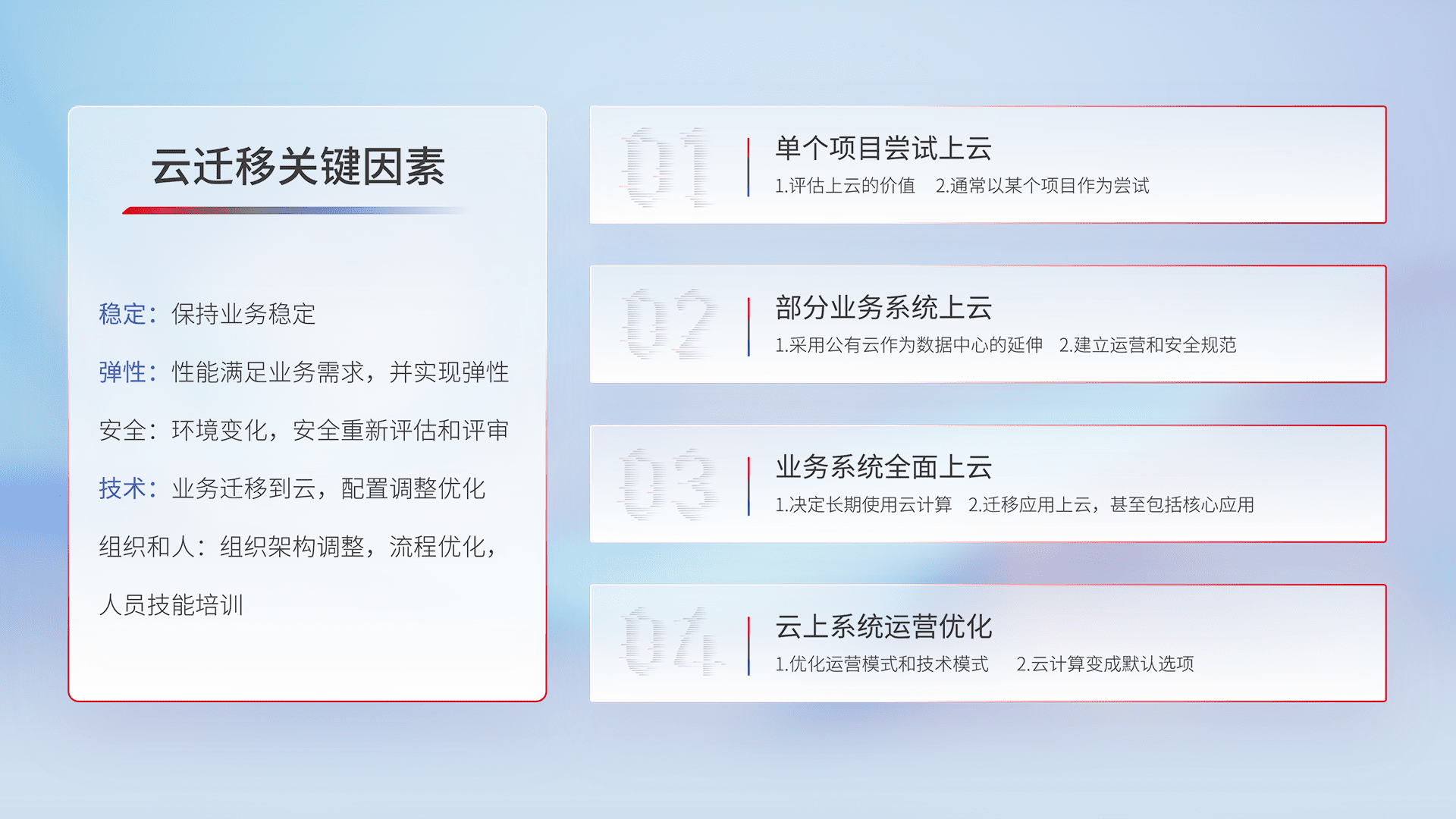 结合实际业务,,,从规划设计、、云平台选型、、、、云原生改造、、数据迁移、、、集成交付,,,,迁移全过程为客户识别最佳上云路径,,做好风险识别管理,,,,设计网络架构、、、、身份权限、、、、安全审计合规、、、、操作审计、、、、日志审计、、监控告警策略、、、、多站点容灾设计等,,,,对云上基础设施进行整体规划,,,提升IT治理水平,,以满足弹性、、高可用、、、、高性能的需求。。