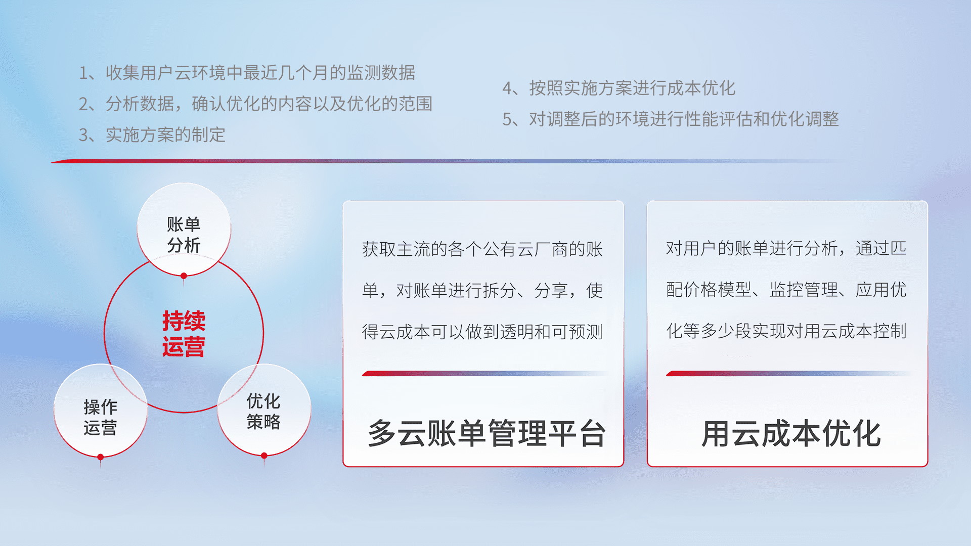 通过多云纳管,,,以统一的资源数据模型把客户的云资源进行抽象和封装,,,进而实现对多云资源的统一操作,,,保障云资源管理的可靠性、、、、稳定性与可用性。。量身定制化运维内容,,,配置、、、、开发运维、、补丁管理、、、、备份、、、、监控、、认证和访问管理、、、审计和日常巡检等,,,保障在用云过程中的可靠度,,稳定度以及高可用率。。。